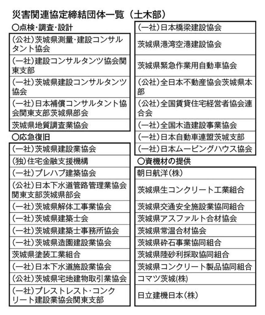 あくまで、道路が被災した場合の一例でしたが、ほかにも建築関係であれば茨城県建築士会、茨城県解体工事業協会や日本補償コンサルタント協会などに協力要請するなど、多くの団体の皆様の協力があってはじめて前述の二つの計画が成り立つことになり、あらゆる災害に対応していただいていることに改めて感謝を申し上げます。