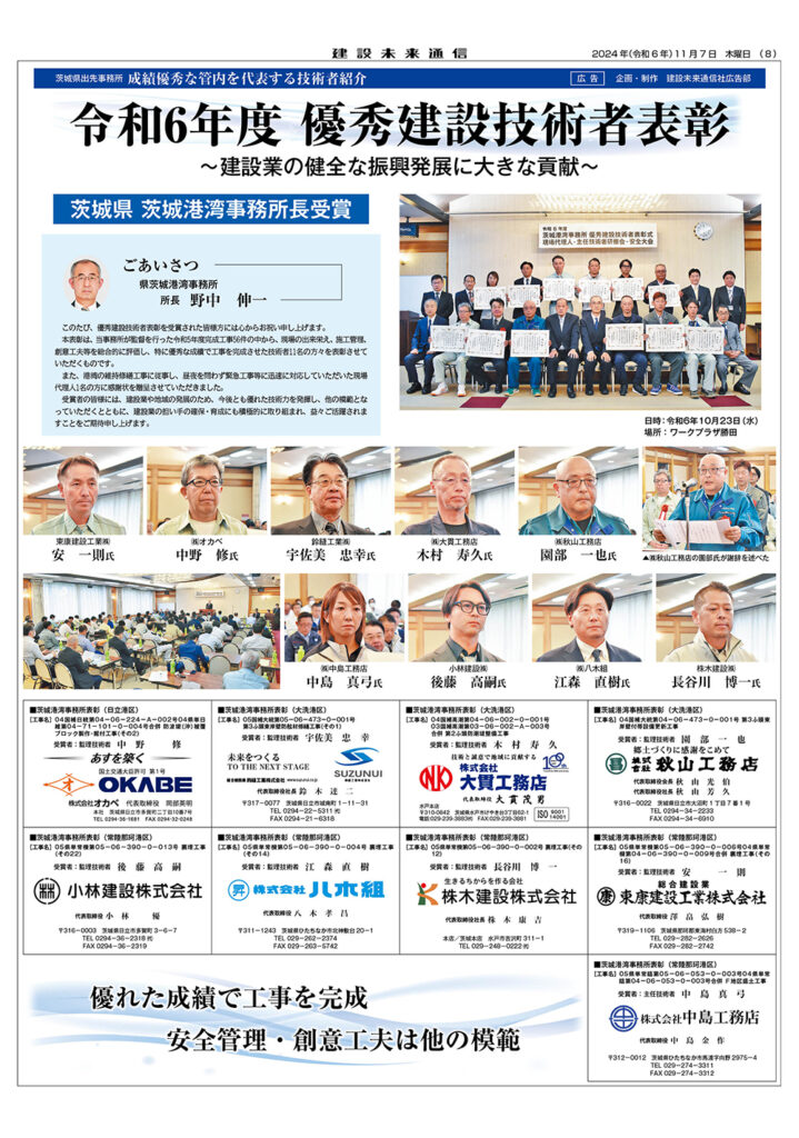 令和6年度 優秀建設技術者表彰 茨城県 茨城港湾事務所長受賞