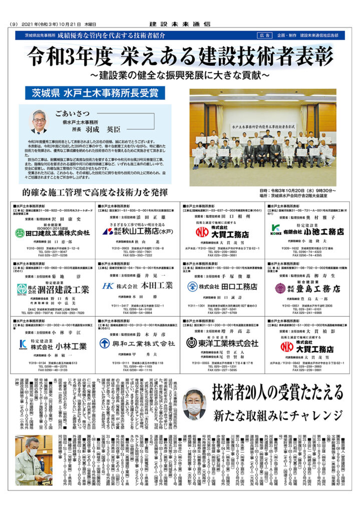 令和3年度 栄えある建設技術者表彰 茨城県 水戸土木事務所長受賞