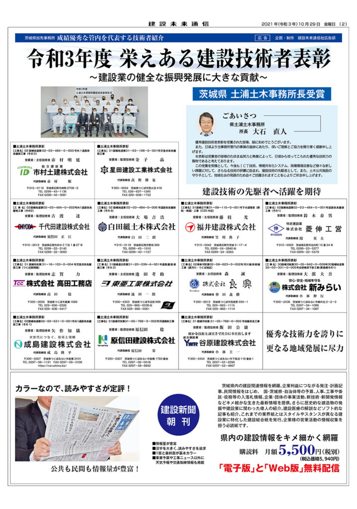 令和3年度 栄えある建設技術者表彰 茨城県 土浦土木事務所長受賞