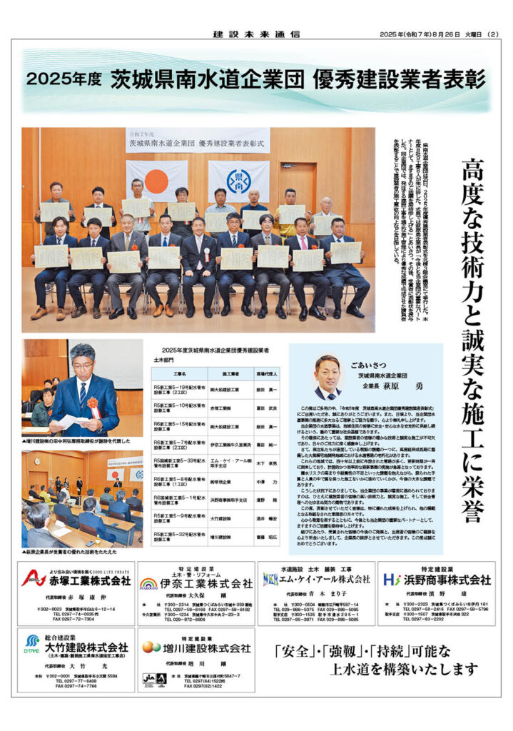 2025年度 茨城県南水道企業団 優秀建設業者表彰