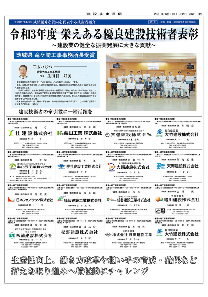 令和3年度 栄えある優良建設技術者表彰 茨城県 竜ケ崎工事事務所長受賞