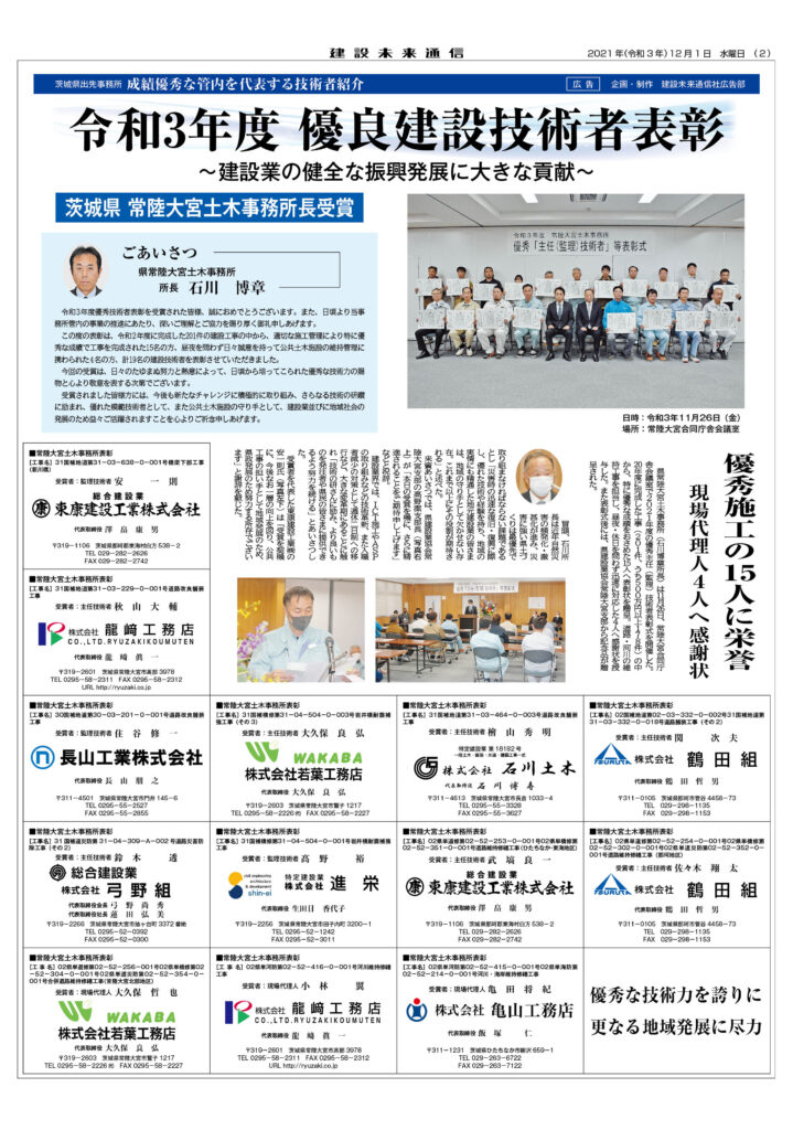 令和3年度 優良建設技術者表彰 茨城県 常陸大宮土木事務所長受賞