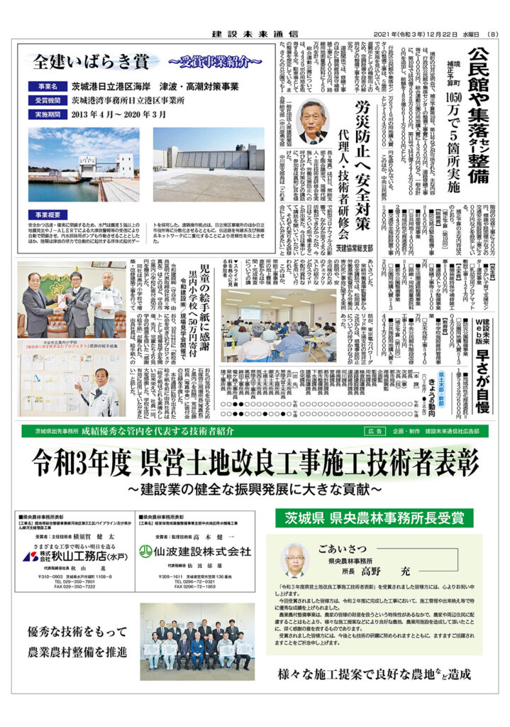 令和3年度 県営土地改良工事施工技術者表彰 茨城県 県央農林事務所長受賞