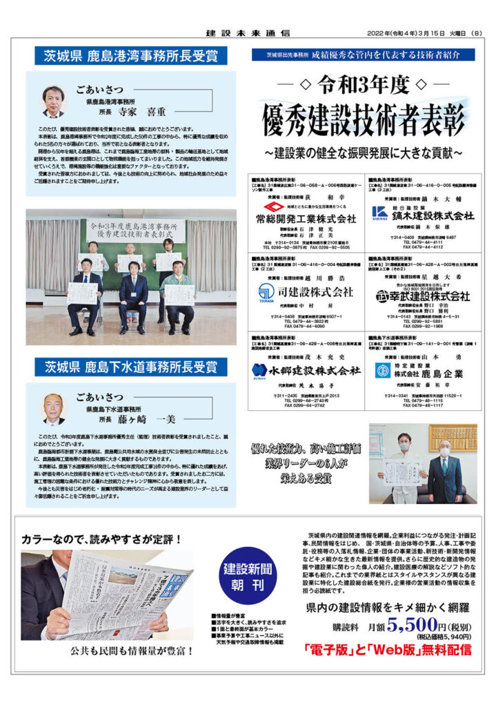 令和3年度 優秀建設技術者表彰 茨城県 鹿島港湾事務所・鹿島下水道事務所長受賞