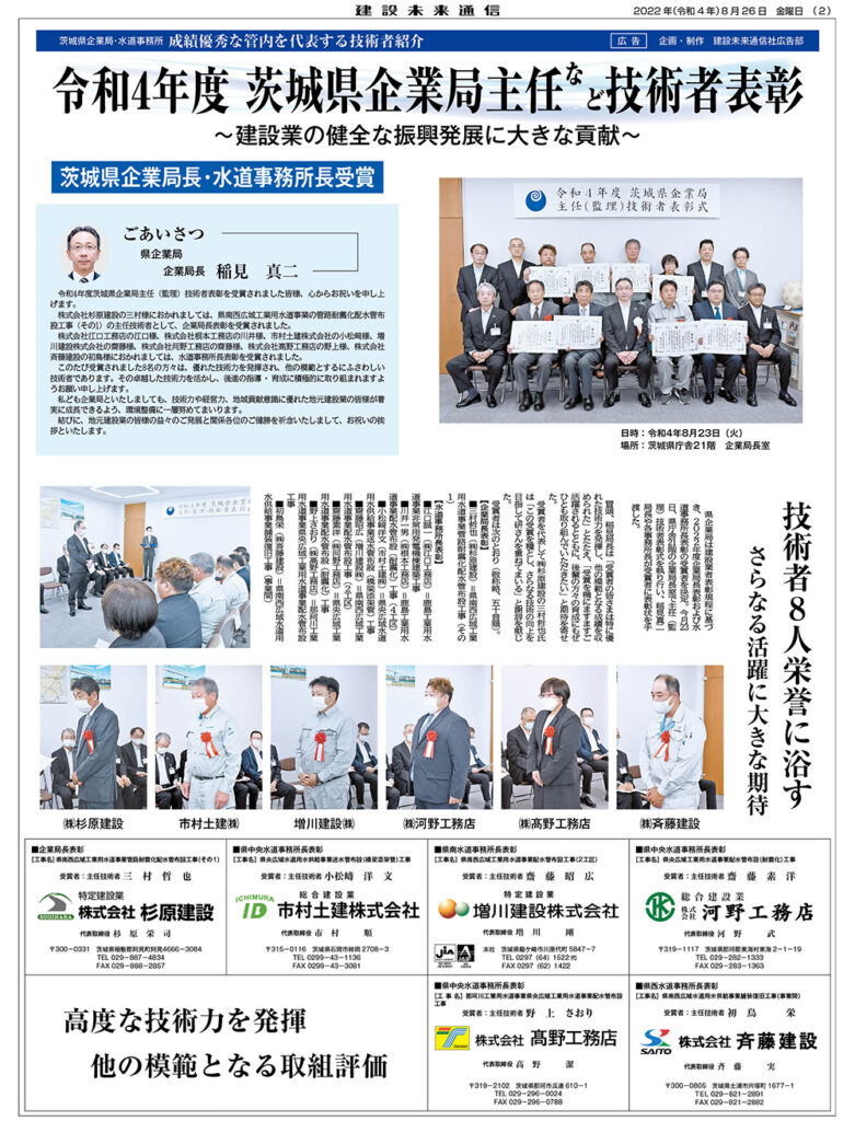 令和4年度 茨城県企業局主任など技術者表彰 茨城県企業局長・水道事務所長受賞
