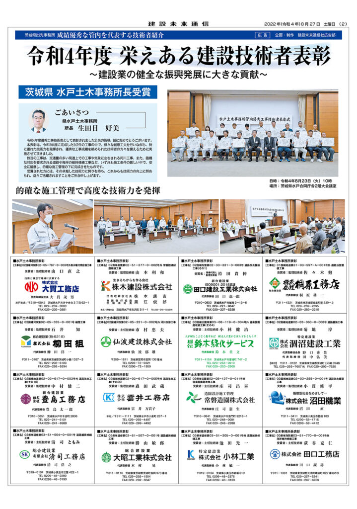 令和4年度 栄えある建設技術者表彰 茨城県 水戸土木事務所長受賞