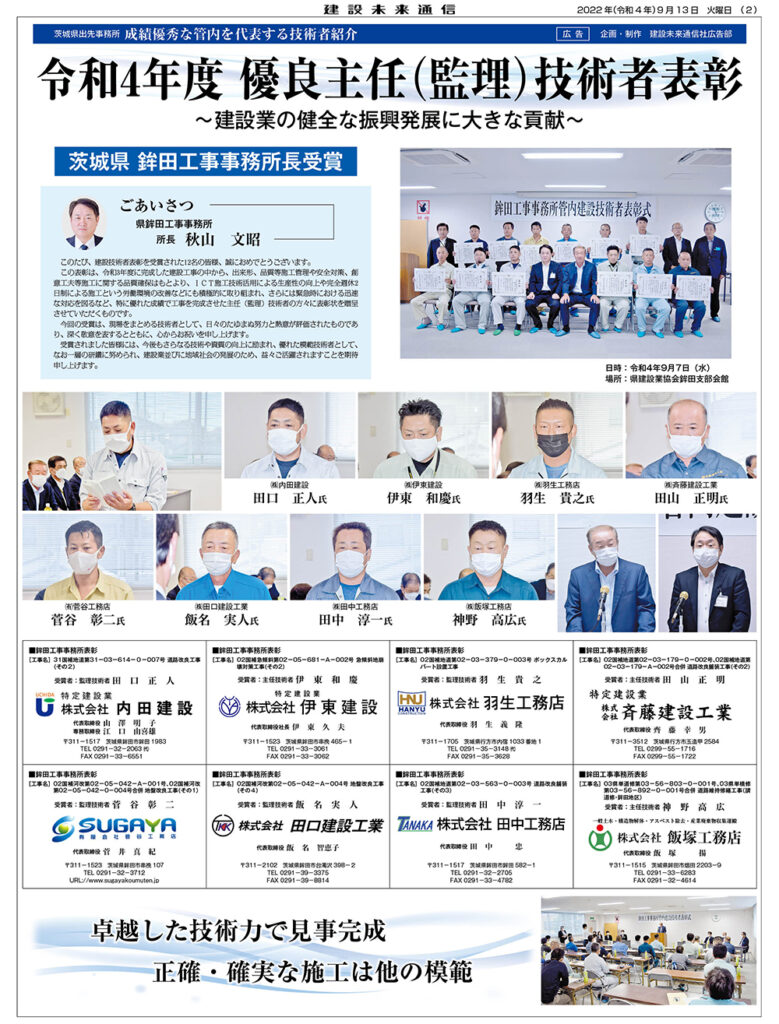 令和4年度 優良主任(監理)技術者表彰 茨城県 鉾田工事事務所長受賞