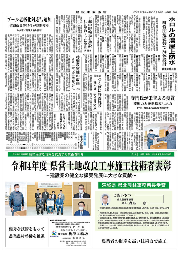 令和4年度 県営土地改良工事施工技術者表彰 茨城県 県北農林事務所長受賞