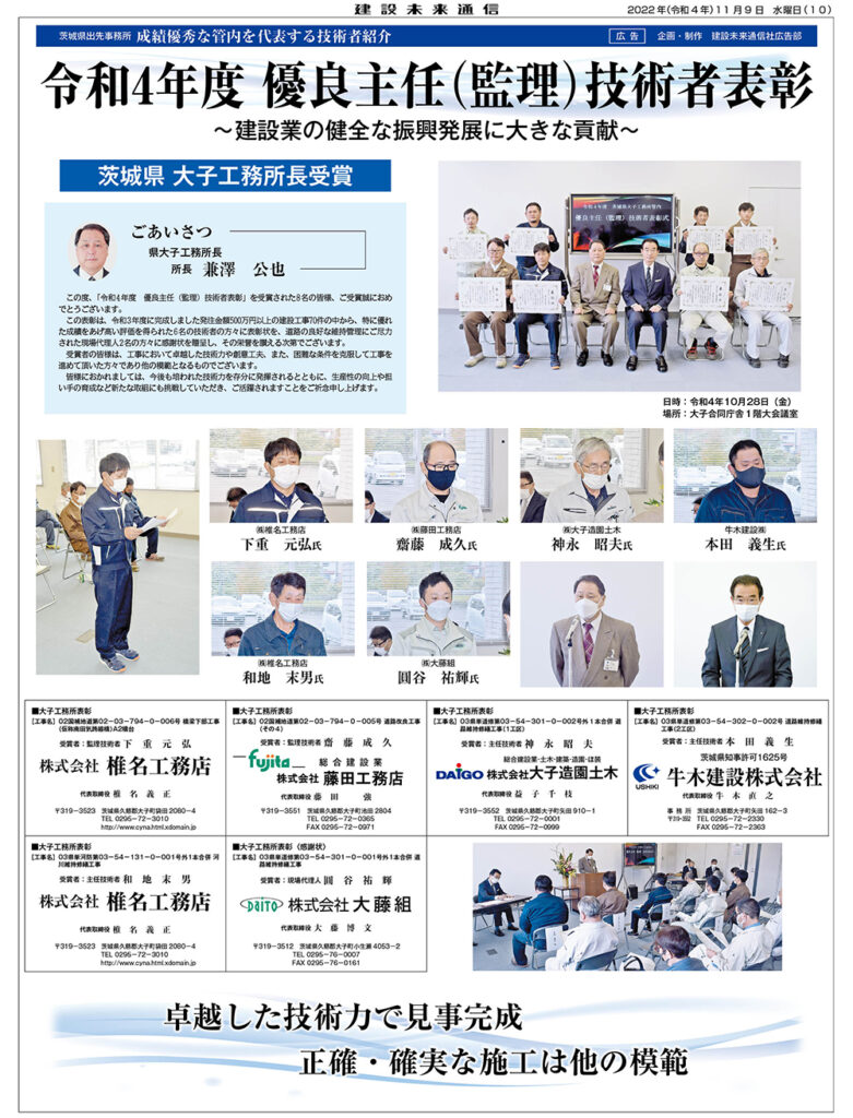 令和4年度 優良主任(監理)技術者表彰 茨城県 大子工務所長受賞