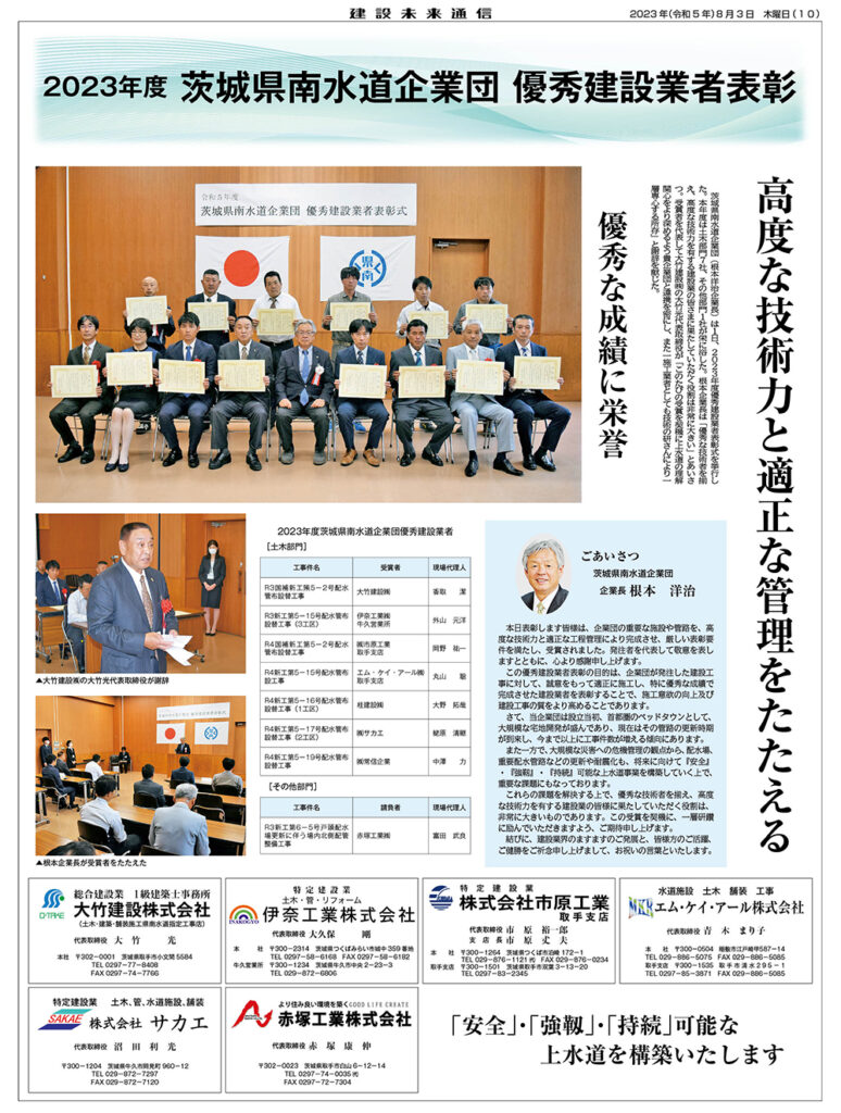 2023年度 茨城県南水道企業団 優秀建設業者表彰