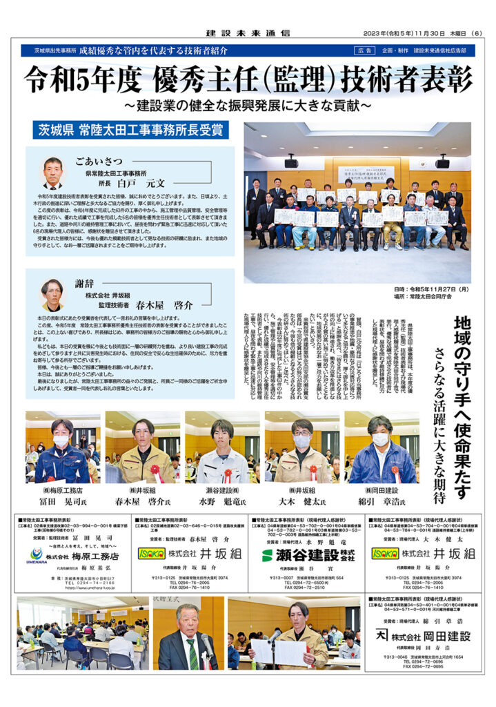 令和5年度 優秀主任(監理)技術者表彰 茨城県 常陸太田工事事務所長受賞