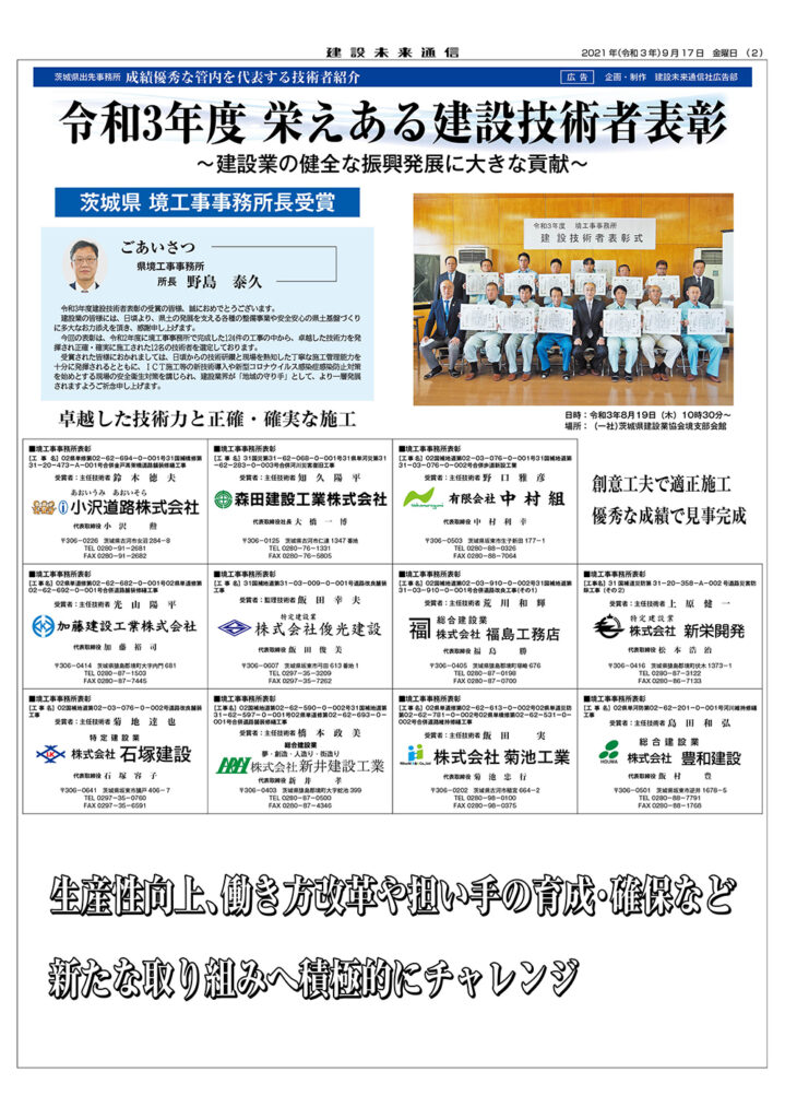 令和3年度 栄えある建設技術者表彰 茨城県 境工事事務所長受賞