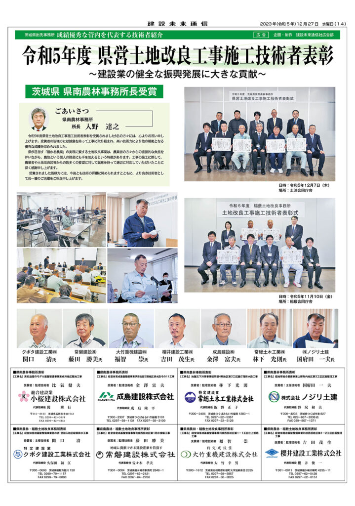 令和5年度 県営土地改良工事施工技術者表彰 茨城県 県南農林事務所長受賞