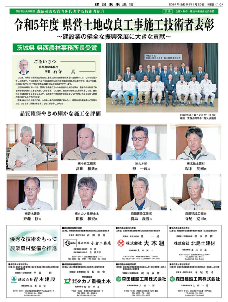 令和5年度 県営土地改良工事施工技術者表彰 茨城県 県西農林事務所長受賞
