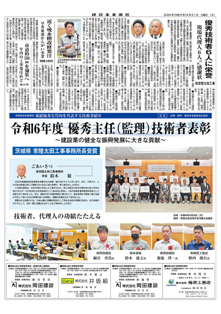 令和6年度 優秀主任(監理)技術者表彰 茨城県 常陸太田工事事務所長受賞