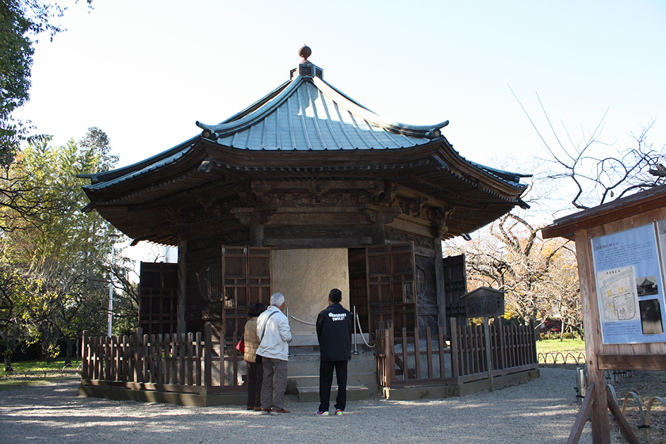 ③学校敷地の中心部を「建学の精神的基盤」を表現するエリアとし、鹿島神社・孔子廟とともに建学精神を記した「弘道館記碑」を納める八卦堂を配していることも全国唯一の事例です。この建物の配置には、斉昭の「こだわり」が感じられます。すなわち八卦堂は八方角に合わせ、鹿島神社(鹿島神宮の分祀)は北をさして社殿と参道を設定しています。これは、斉昭が対ロシアへの防衛上重視していた蝦夷地(北海道)を意識していること、鹿島神宮(鹿嶋市)もほぼ北向きに社殿が建てられていることにも関連しているものと思われます。