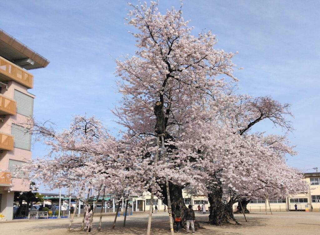 写真は土浦市立真鍋小学校のソメイヨシノです(県指定天然記念物)。もとは校庭の端にあったのですが、校庭拡張後もそのまま残され、中央に立っています。