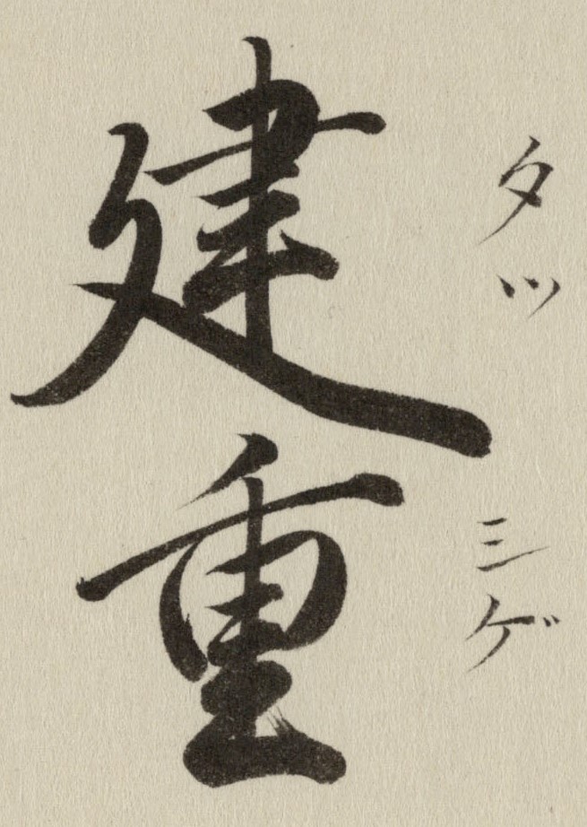 これによると誕生時には、祖父から「鎮三郎」と名付けられますが、「鎮」に「ヤス」とルビが振られた文書が添えられており、これは「ヤスサブロウ」と読むことがわかります。元服時には、父親の松平義建から「建」の字を与えられ、「建重」という「諱(いみな)」名を贈られます。これも「タツシゲ」とルビが振られた文書(写真)があることにより読みがわかります。なお、元服時に父の名の一字を与えられるのは武家の慣習であったようで、たとえば慶喜は父斉昭から「昭致」と名付けられています。