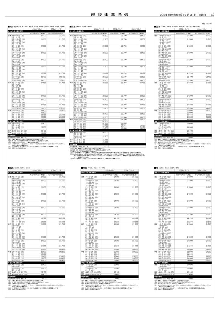 生コンクリート資材単価表(2024年11月1日改定、改定分のみ)