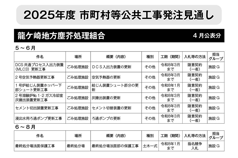 龍ケ崎地方塵芥処理組合発注見通し(4月公表分)