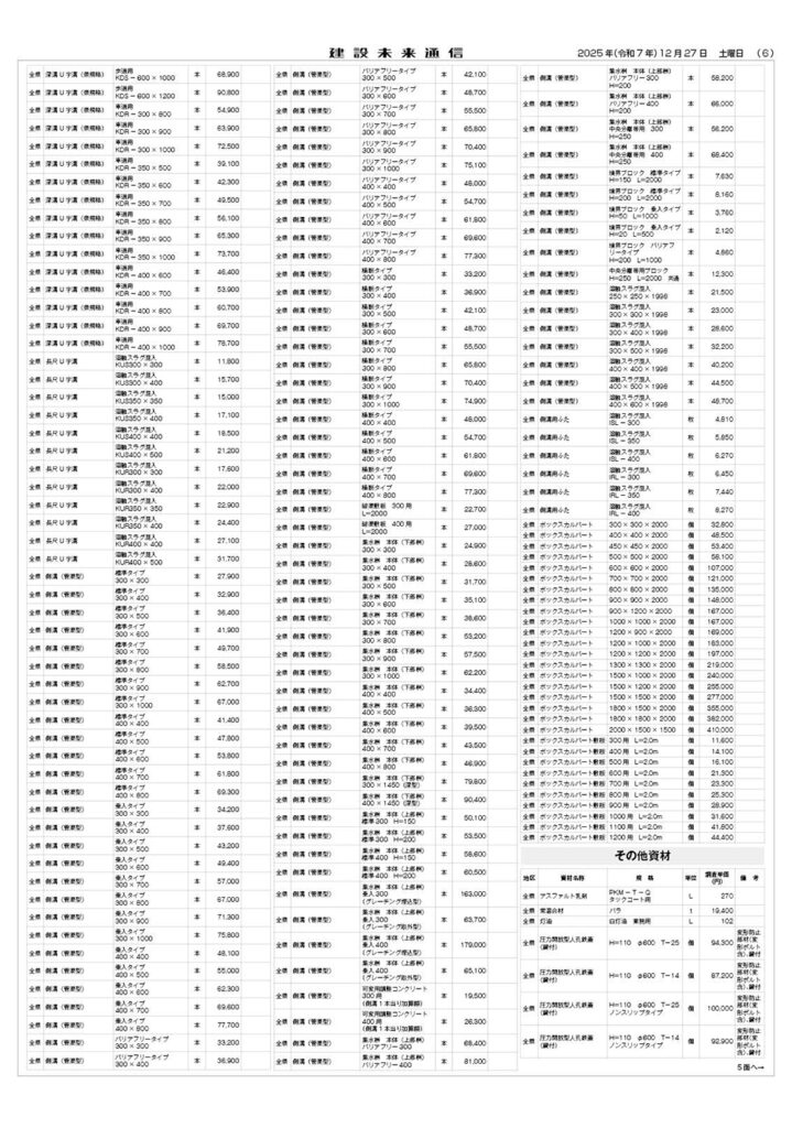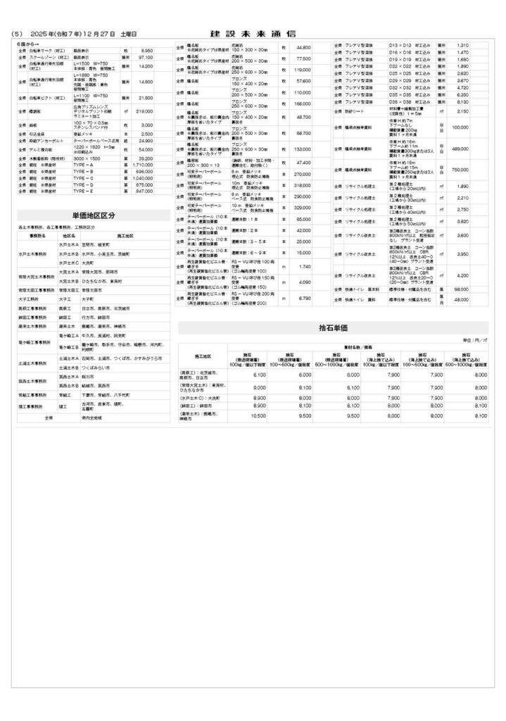 県土木部資材単価表(2026年1月1日改定、改訂分)