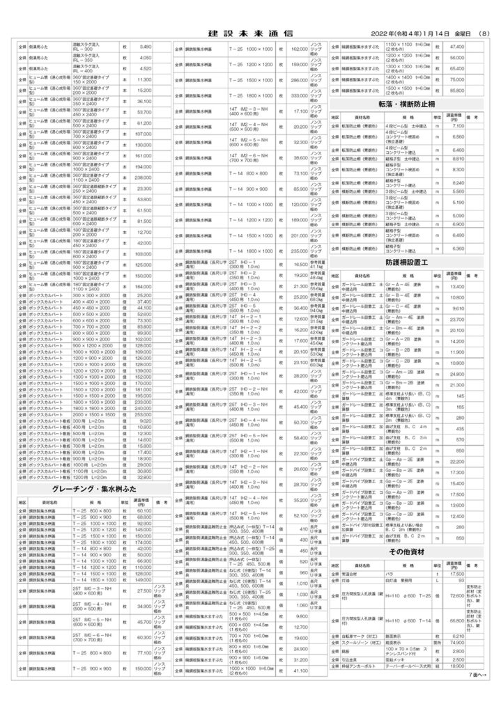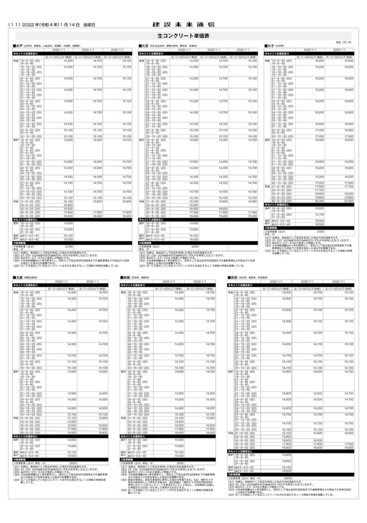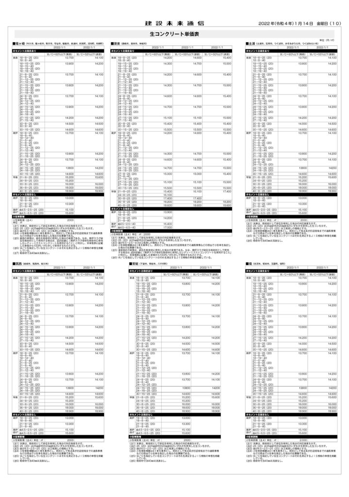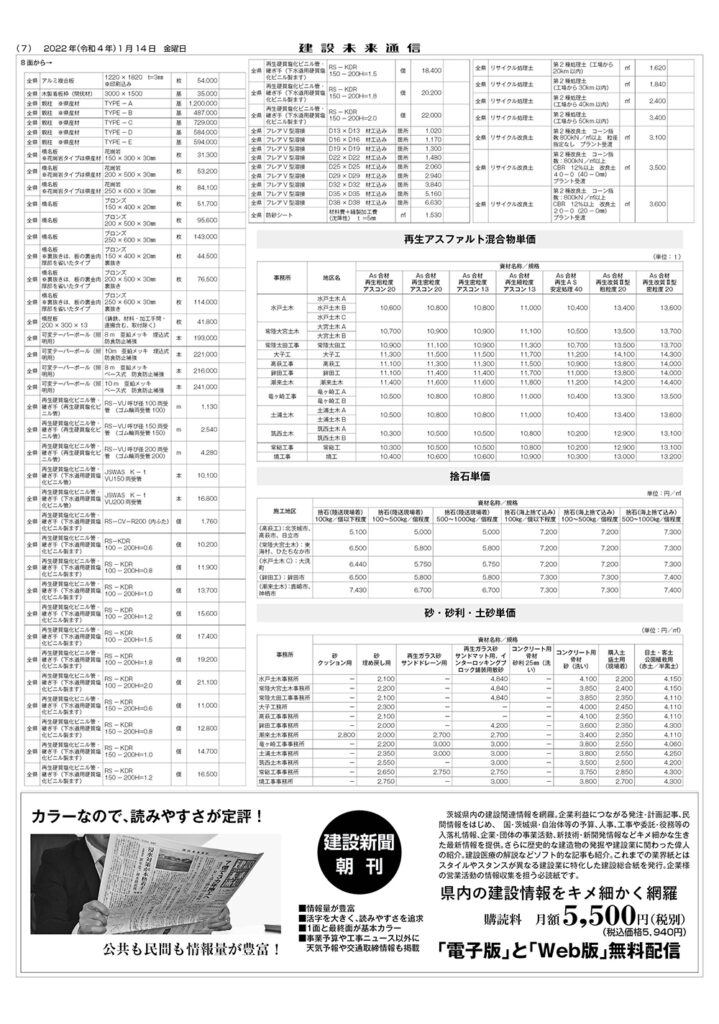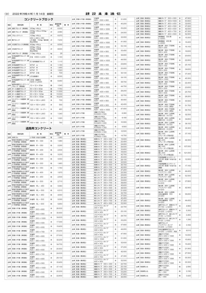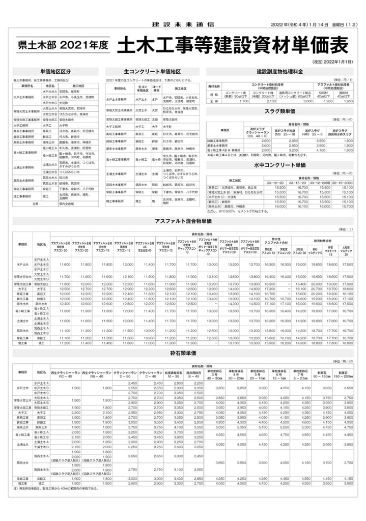 県土木部資材単価表(2022年1月1日改定)