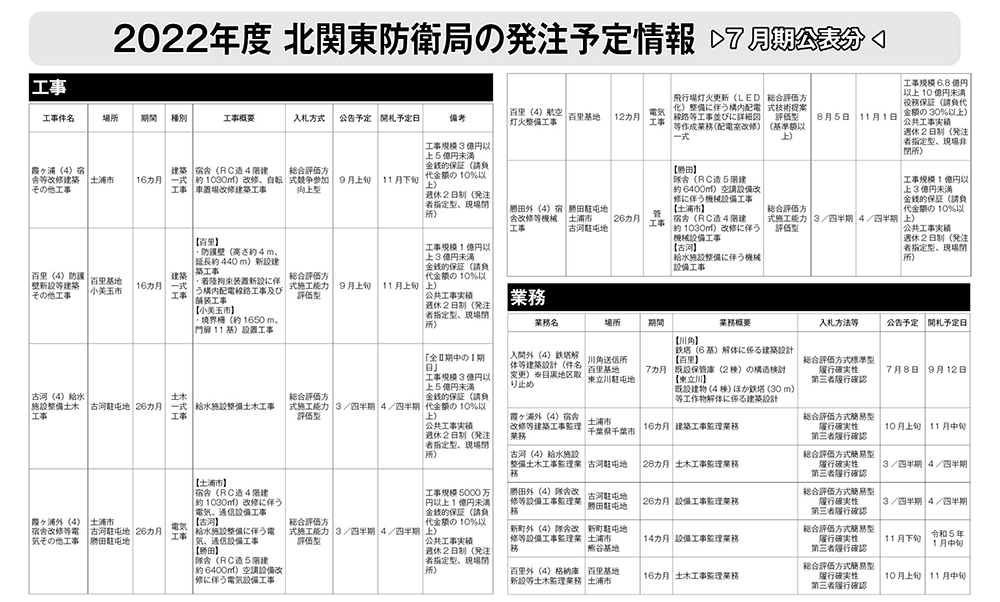 北関東防衛局発注見通し(2022年度7月公表)