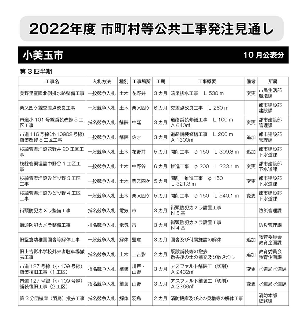 小美玉市発注見通し(2022年度10月公表)