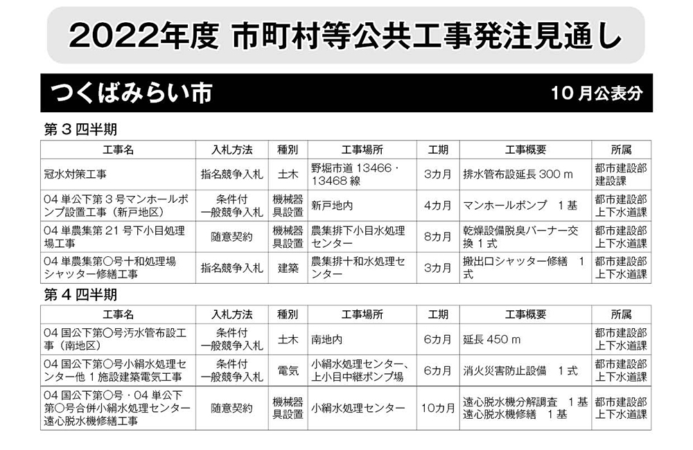 つくばみらい市 発注見通し(2022年10月公表)