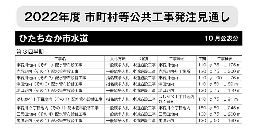 ひたちなか市水道 発注見通し(2022年10月公表)