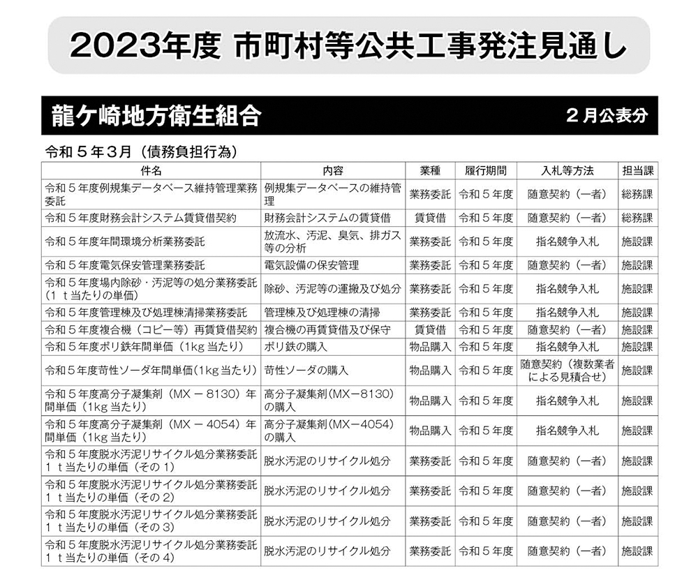 龍ケ崎地方衛生組合 発注見通し(2023年2月公表)