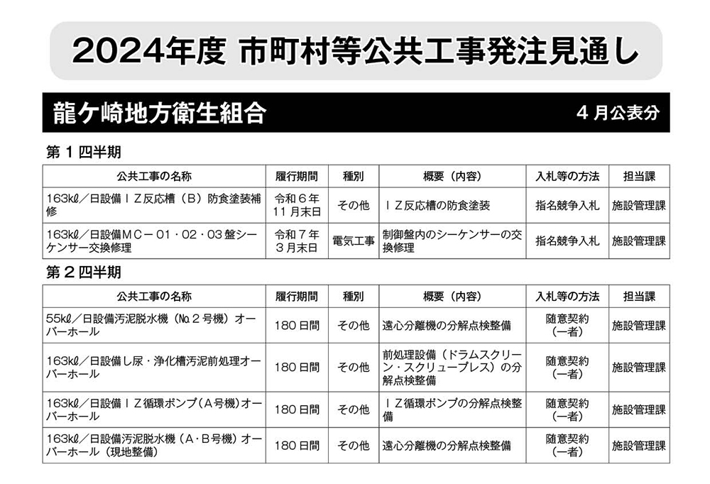 龍ケ崎地方衛生組合発注見通し(2024年度4月公表)