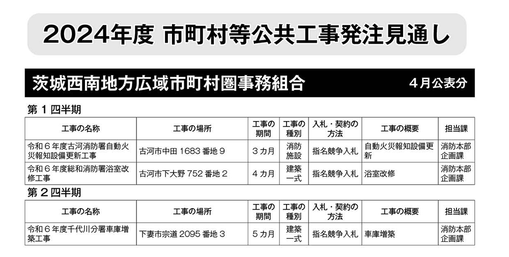 茨城西南地方広域市町村圏事務組合発注見通し(2024年度4月公表)
