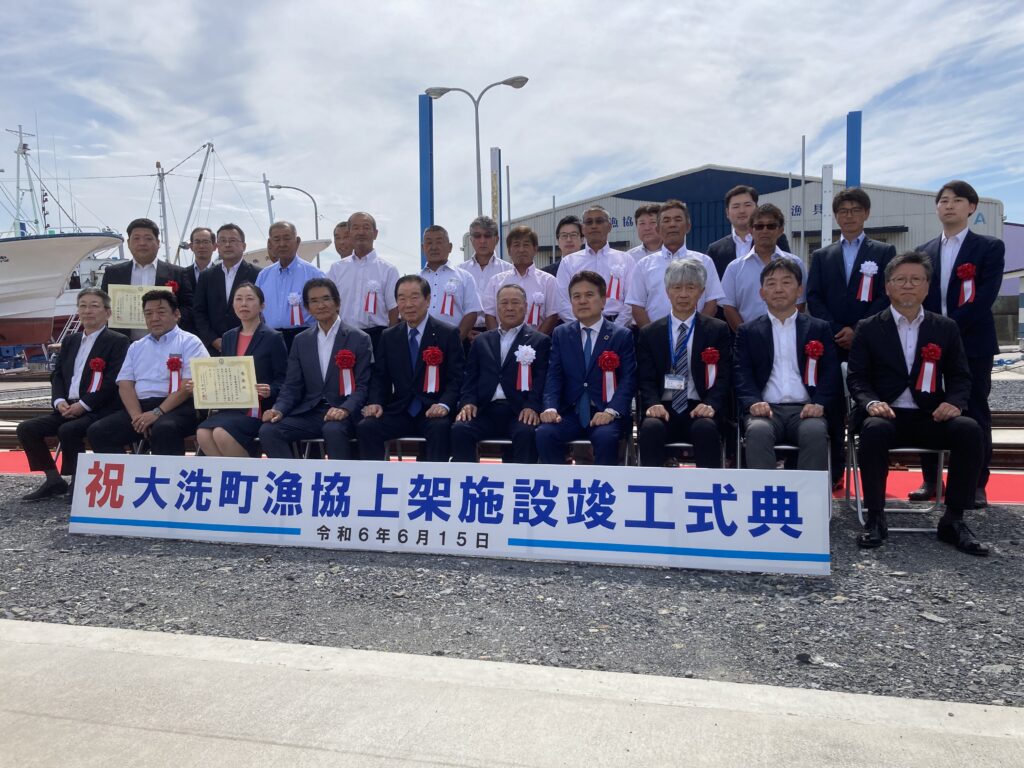 大洗町漁業協同組合(飛田正美組合長)の上架施設がこのほど完成し、6月15日に竣工式典が挙行された。当日は地元の國井豊大洗町長をはじめ、額賀福志郎衆議院議長、田山東湖県議会議員も参列。出席者全員で施設の完成を祝うとともに、今後のさらなる発展を願った。