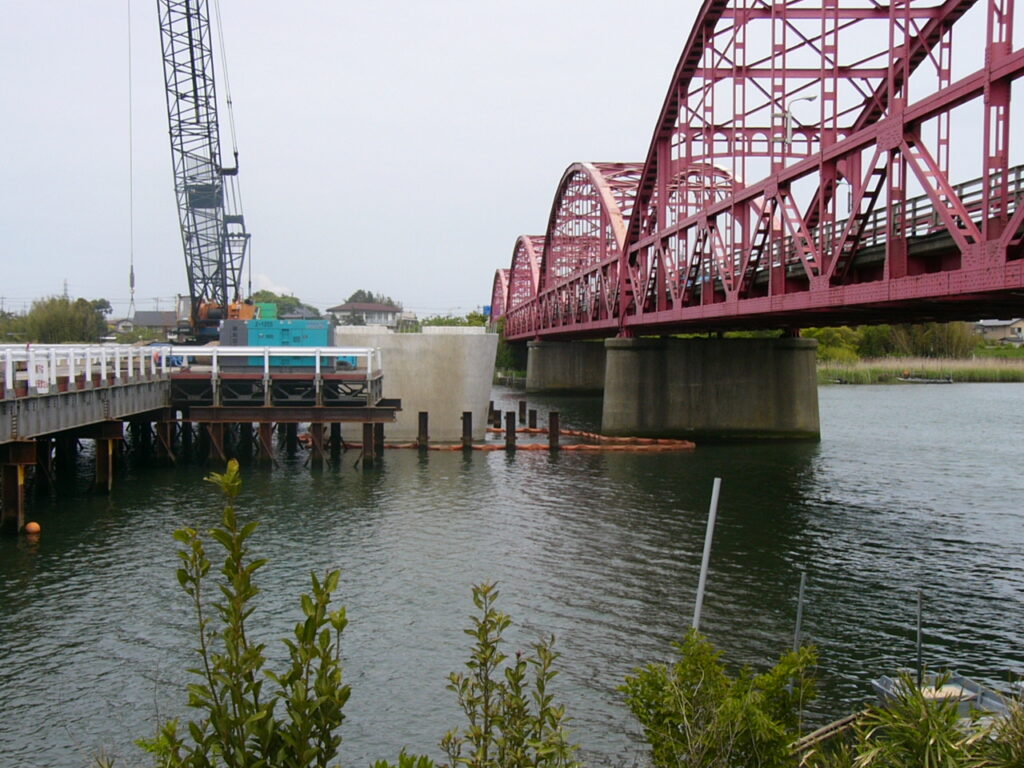 湊大橋は、第一期工事として、上流側に下り線2車線の整備を進め、02年度から河川区域外の橋梁下部工に着手しました。私が担当している間に、上部工にも着手しました。
