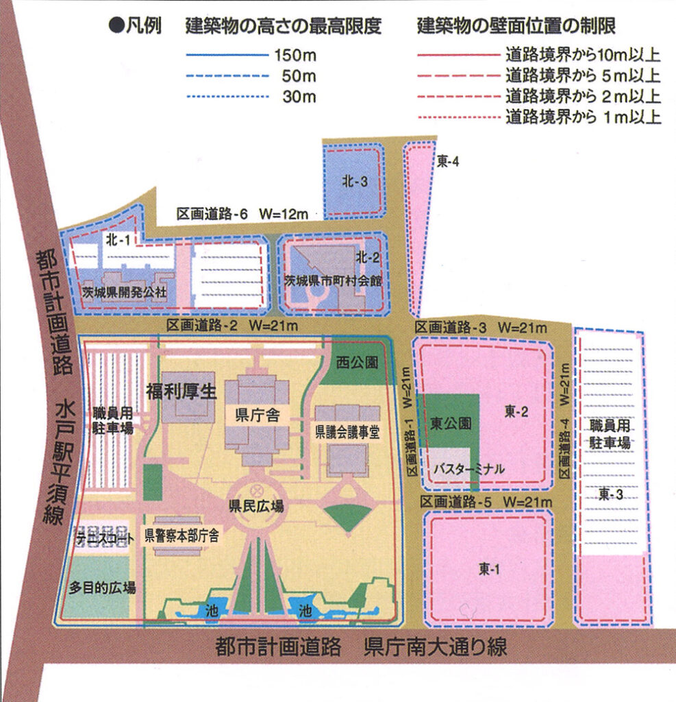 県庁舎西側の都市計画道路水戸駅平須線(国道50号バイパス~日産ディーゼル)L=1250m、W=35m(4車線、歩道7・5m×2)、地権者数76人、家屋移転戸数23戸(大規模家屋14戸)用地面積1万8700㎡、南側の都市計画道路県庁南大通り線(水戸駅平須線~市道梅香下千波線線)L=1680m、W=40m(4車線、歩道10m×2)、地権者数25人、家屋移転4戸、用地面積3万500㎡、県庁周辺土地区画整理事業34ヘクタール、区画道路1~6号線L=2005m、W=21m~12mの整備などが、主な事業でした。